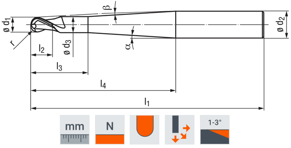 Carbide ball-nose cutter Top-Cut in extra long version (8xD) for universal roughing - and finishing applications in many materials.