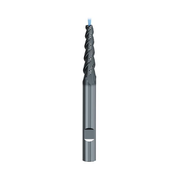 Turbine tapered carbide torus end mill for roughing applications in high-strength materials, and nickel-based or titanium alloys.
