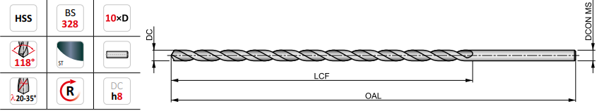 Extra long length drill with straight shank, diameter 4mm with an overall length of 250mm and flute length of 200mm according to BS 328 standard with 118° conical point, HSS with steam tempered finish for 10xD single pass drilling without pecking in steel