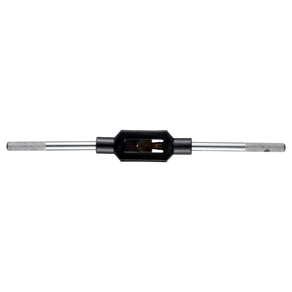 Adjustable, so one tap wrench can be used to hold several different tap sizes. The square end of the tap is inserted into the wrench which is then tightened to hold the tap securely. The two metal bars on either side of the wrench are used to rotate the tap in the hole of the workpiece to create the thread.